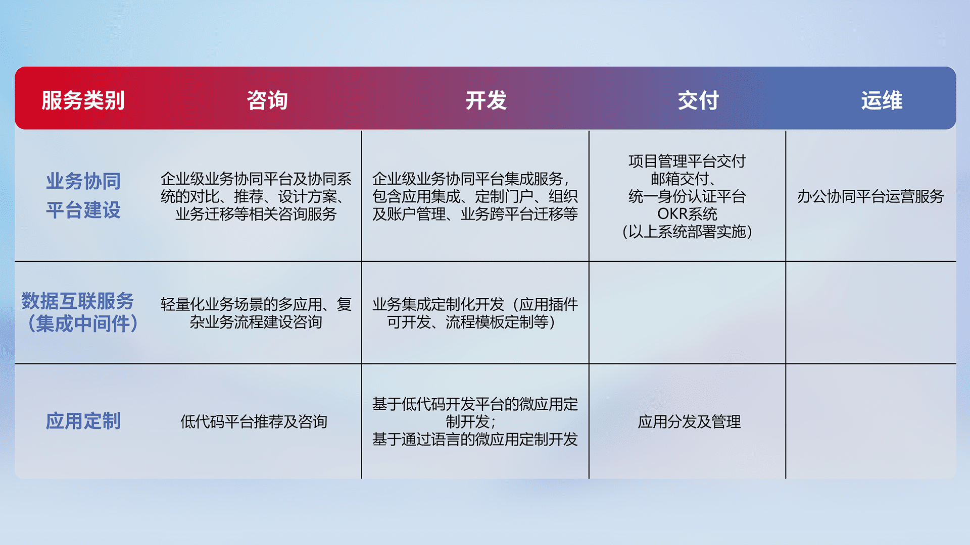 针对钉钉、、企微、、IDaas等平台级产品提供产品的规划、、、方案、、、、交付、、定制化开发等服务,,,实现如统一协同办公、、、智能客户服务、、混合会议管理、、、智能数据查询、、、、等业务场景,,,,实现数字化转型。。
