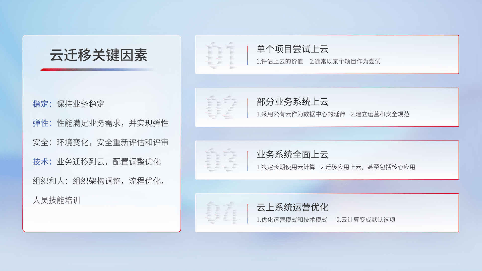 结合实际业务,,,从规划设计、、、、云平台选型、、、云原生改造、、、数据迁移、、集成交付,,迁移全过程为客户识别最佳上云路径,,,做好风险识别管理,,,设计网络架构、、身份权限、、、、安全审计合规、、、、操作审计、、、日志审计、、、监控告警策略、、多站点容灾设计等,,,,对云上基础设施进行整体规划,,,提升IT治理水平,,,以满足弹性、、高可用、、、高性能的需求。。。。